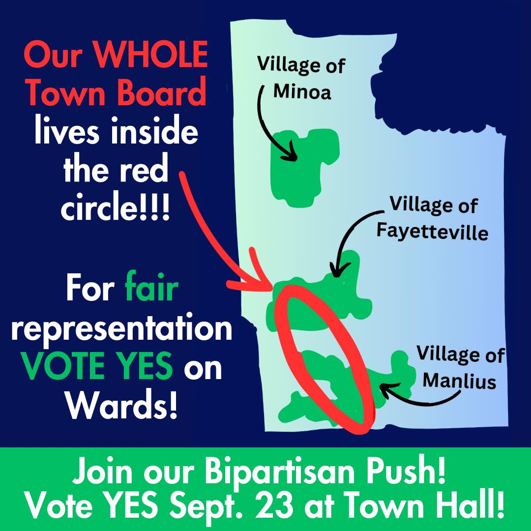 The time has come for a ward system to guarantee fair representation across the town of Manlius. Vote “yes” from 9 a.m. to 5 p.m. Sept. 23, 2023, at Manlius Town Hall.